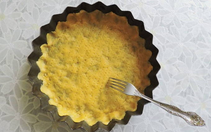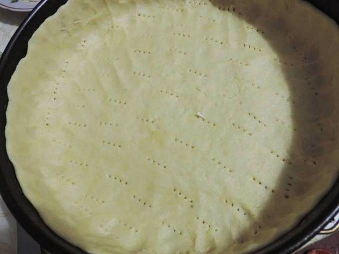 - Het deeg wordt over de ovenschaal verdeeld, vormt hoge randen, en prikt met een vork om niet te zwellen in de oven.