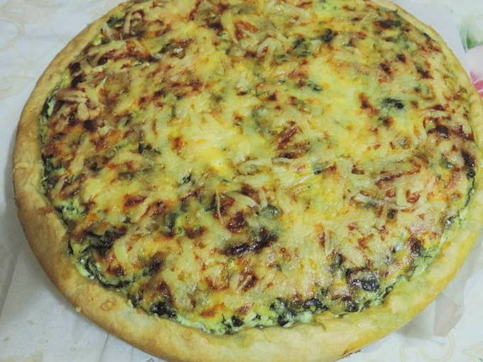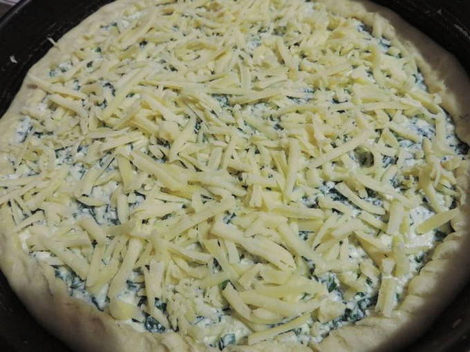 - Verdeel de vulling over het deeg en bestrooi met de rest van de kaas. De taart wordt een half uur in de oven gezet en 180 graden gedraaid.