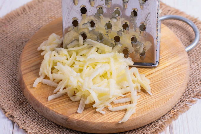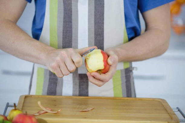 - De appels worden geschild en klokhuis verwijderd, tot schaafsel gewreven en vermengd met kaneel.
