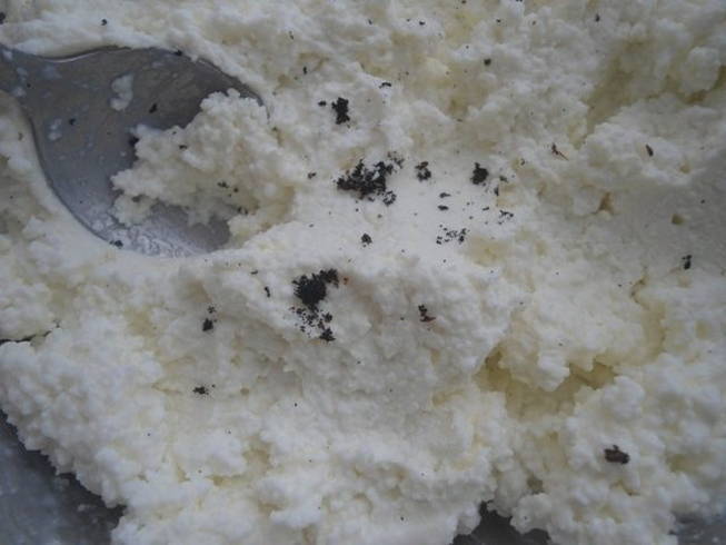 - Klop de wrongel met een blender of maal met een fijne zeef en meng met suiker, ei en vanille tot een luchtige en malse wrongelmassa.