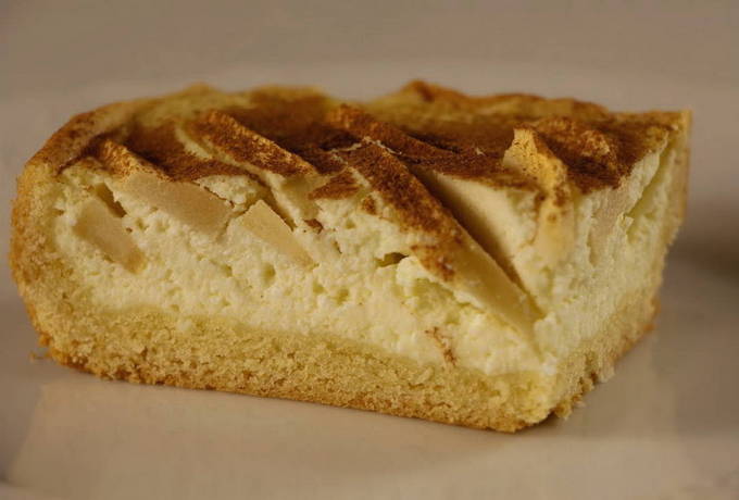- Een andere laag deeg wordt bovenop het fruit gegoten en vervolgens een wrongelvulling. Strijk glad en bestrooi met nog een kwart van het deeg. Leg vervolgens de resterende appels neer en bedek opnieuw met het resterende deeg.
