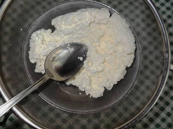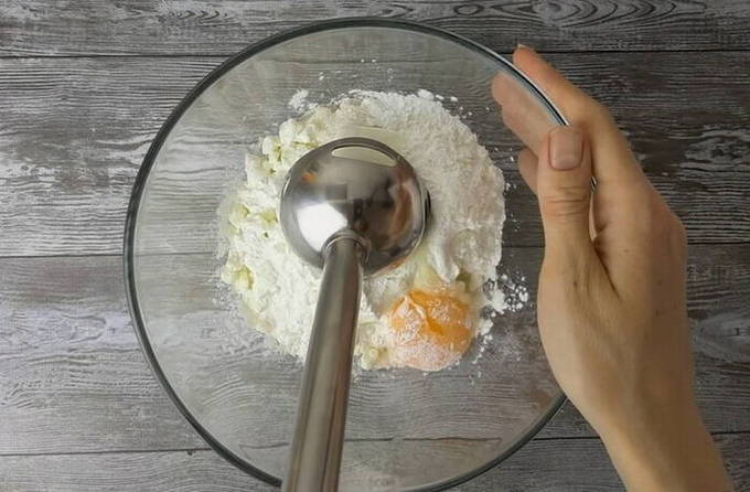 - Kwark wordt door het eimengsel gemengd en weer zo goed mogelijk gemengd, waarna bloem wordt toegevoegd en verder wordt geklopt. Vanillesuiker en een beetje bakpoeder worden toegevoegd aan het geknede deeg, meng opnieuw.