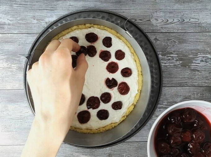 - De kwarkvulling wordt erop verdeeld, de kersen worden zo gelegd dat ze in de wrongelmassa worden ondergedompeld.