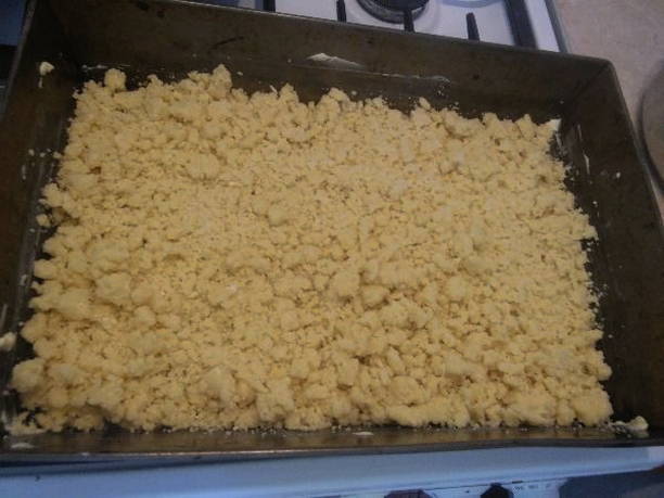 - Gekoelde geraspte margarine wordt met bloem vermalen tot een kruimel. Daarna wordt er een ei in het deeg gedreven, een beetje zure room en weer goed gekneed zodat het homogeen wordt.