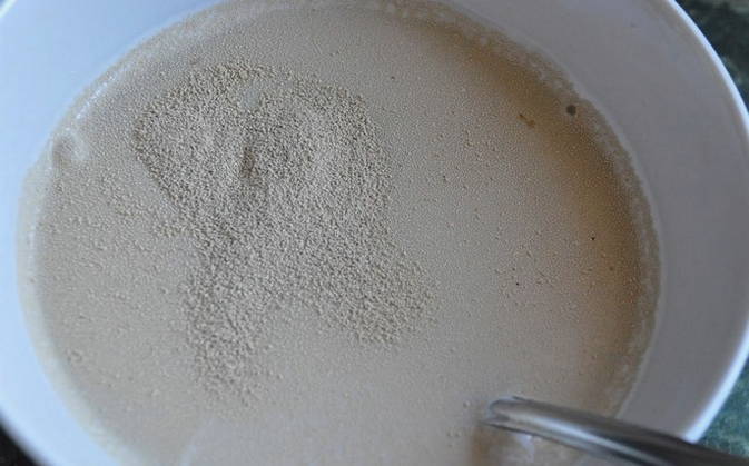 - Meng in een diepe kom het droge mengsel met verdunde gist en twee soorten olie. In dit geval moet de boter eerst worden gesmolten.
