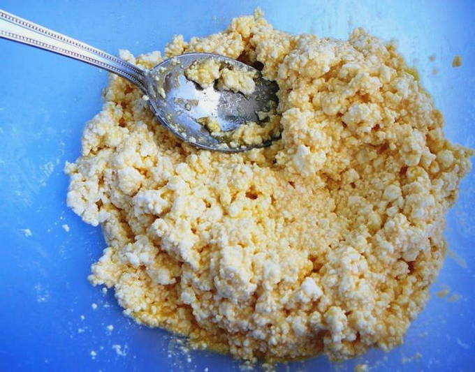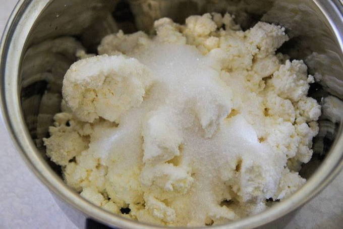 - Combineer gewone en vanillesuiker afzonderlijk met geraspte kwark en voeg daar eieren toe en meng goed.