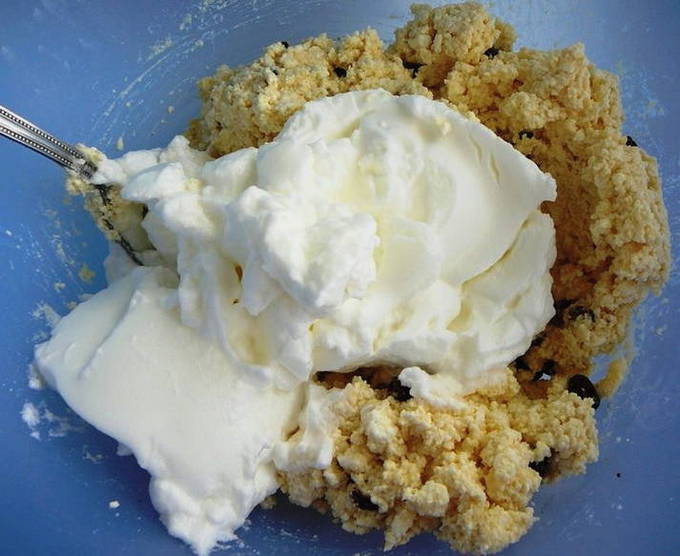 - De wrongelmassa wordt gecombineerd met eiwitten, je moet heel voorzichtig mengen en dan de rozijnen toevoegen en voorzichtig opnieuw mengen.