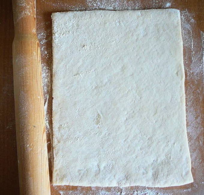 - Het ontdooide bladerdeeg wordt iets uitgerold.