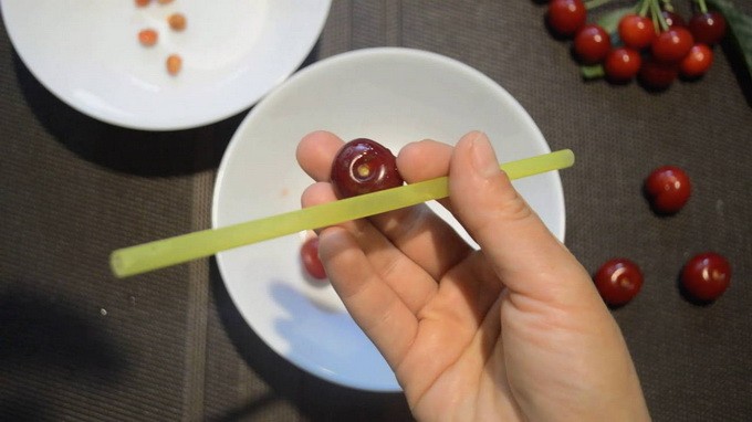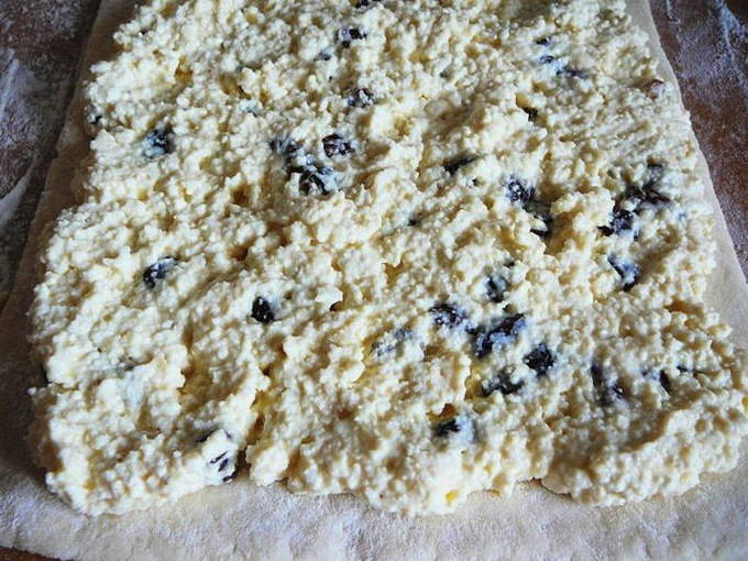 - Kersenbessen worden op de wrongelvulling gelegd, waarvan het beter is om de zaden van tevoren te krijgen. Rozijnen worden tussen de kersen geplaatst.