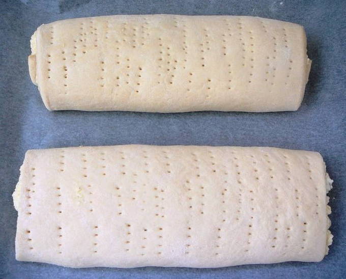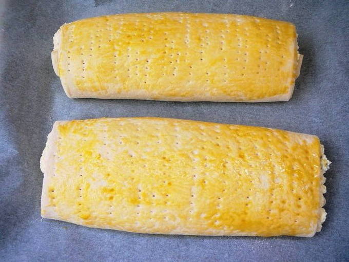- Rol de cake voorzichtig op en knijp in het oppervlak zodat het deeg niet opzwelt tijdens het bakken.