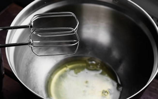 - Eieren worden in een diepe kom gedreven, suiker wordt toegevoegd en de massa wordt goed geslagen met een mixer of garde.