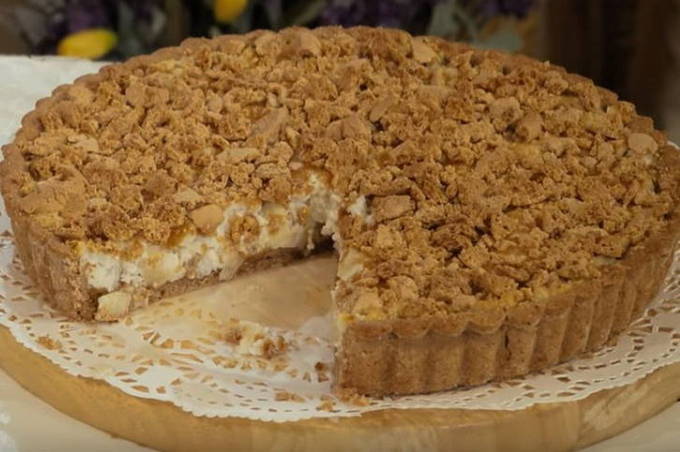 - Verdeel de vulling over het deeg en dek af met het tweede deel van het deeg, dat ook dun wordt uitgerold. Knijp de randen van de taart samen en vet de bovenkant in met een losgeklopt ei, en prik vervolgens het hele oppervlak met een vork zodat de stoom van de vulling eruit komt tijdens het bakken. Bestrooi het deeg met kruimelstreusel erover. De cake wordt 40-50 minuten gebakken in de oven, die op 180 graden is ingeschakeld. Serveer de taart, nadat je hem eerder in porties hebt gesneden.