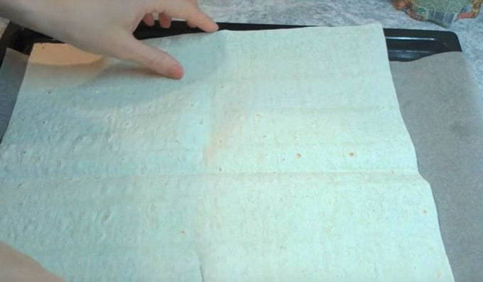 - Een vel pitabroodje wordt op een vlakke ondergrond gelegd.