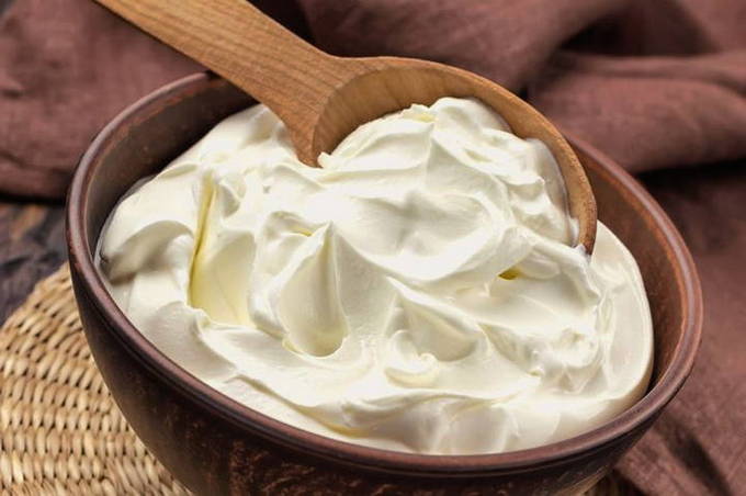 - Meng alles en voeg zure room met vanille toe aan het deeg, klop de hele massa met een mixer.