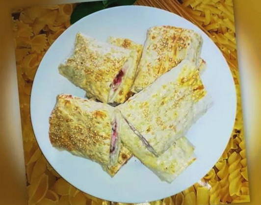 - Het pitabroodje met de vulling wordt voorzichtig opgerold tot een rol, die in twee stukken wordt verdeeld en in een diepe ovenschaal wordt gelegd.