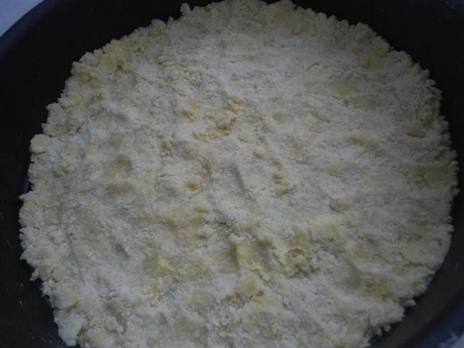- Maal de bloem met licht zachte boter en suiker tot een kruimel van het deeg. Bakpoeder wordt toegevoegd en de massa wordt opnieuw gemalen.