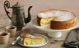 - De cake wordt 45 minuten in de oven bewaard. Verwarming moet worden ingesteld op 180 graden. De afgewerkte cake wordt licht gekoeld geserveerd, indien gewenst bestrooid met poedersuiker.