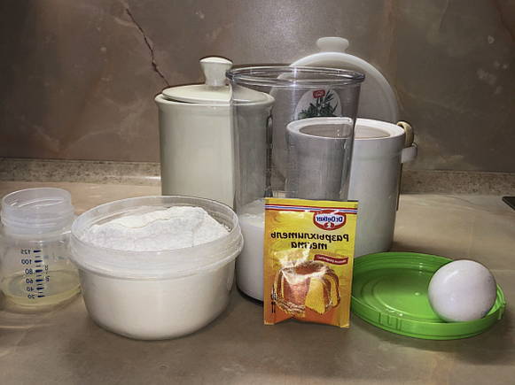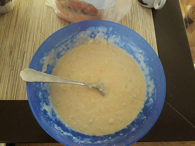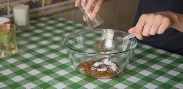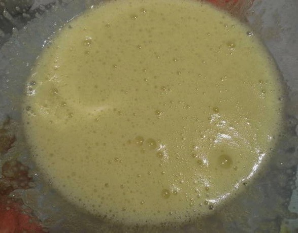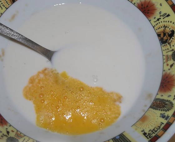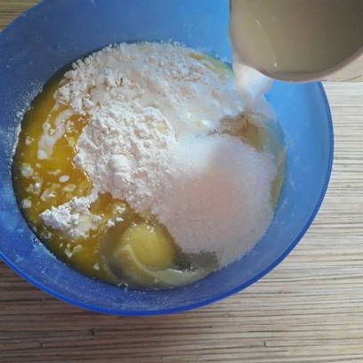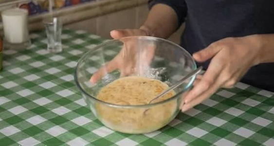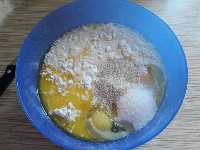 - We verdunnen gist in 100 milliliter water. Voeg er zout, suiker, melk en eieren aan toe.