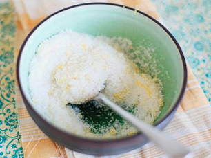 - Giet suiker in een kom, wrijf de schil er in en laat het mengsel staan.