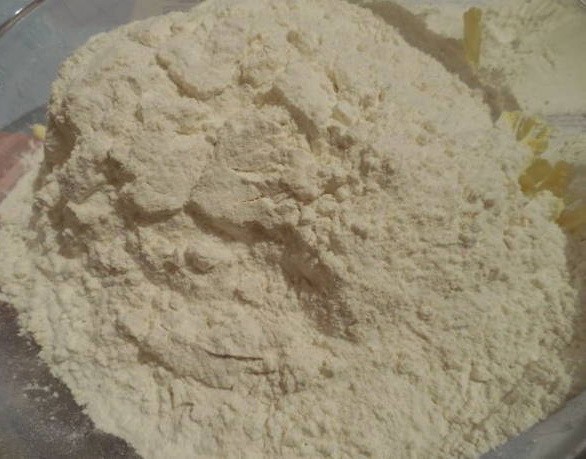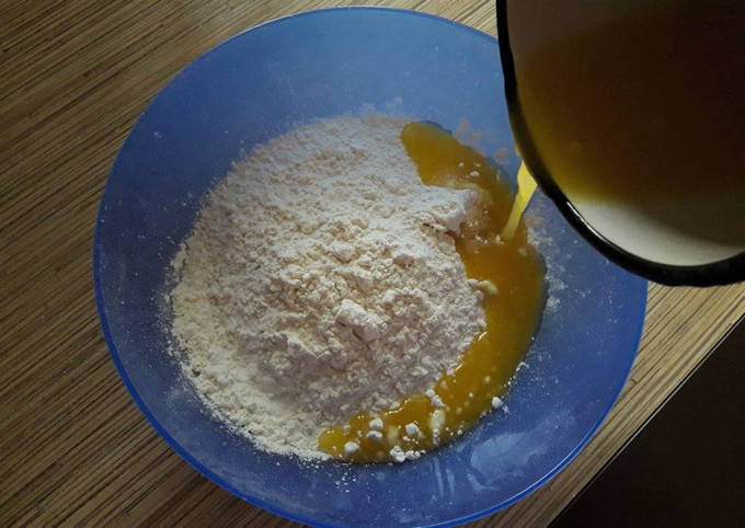 - Giet 2 kopjes bloem in een kom, voeg gesmolten margarine toe.