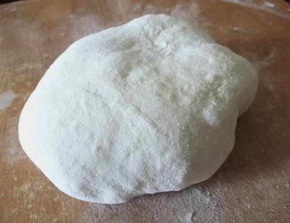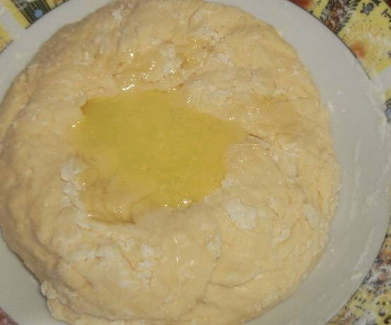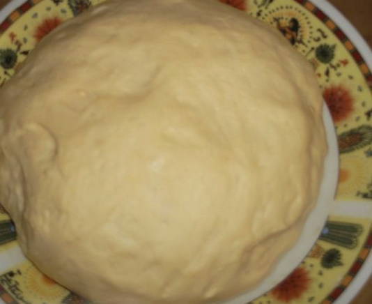 - Voeg een half glas bloem toe aan het gerezen deeg en kneed. Het deeg moet dik, zacht en niet plakkerig zijn. We laten het op een warme plaats staan.