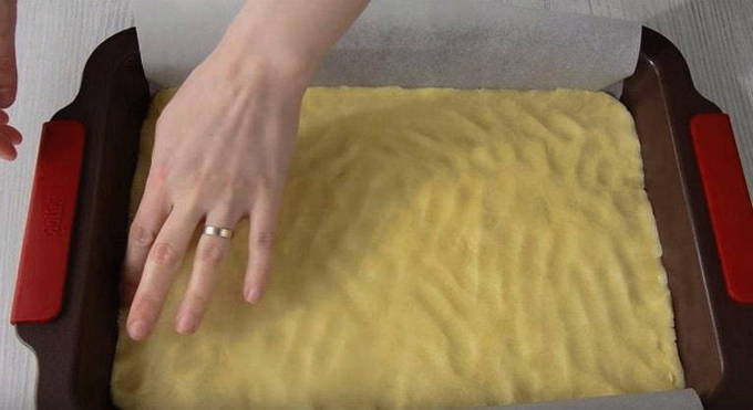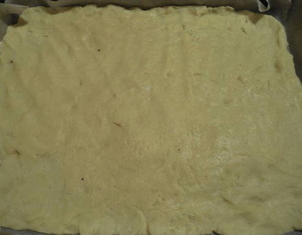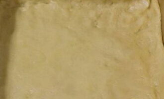 - Verdeel het deeg doormidden, rol de ene helft uit tot een 2 mm dikke laag en leg deze in een vorm. We smeren de bodem in met de vulling.