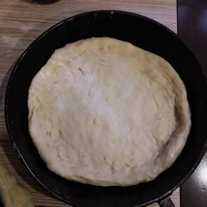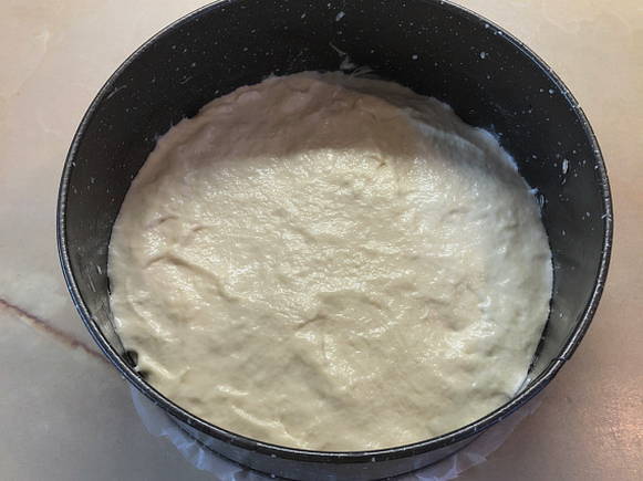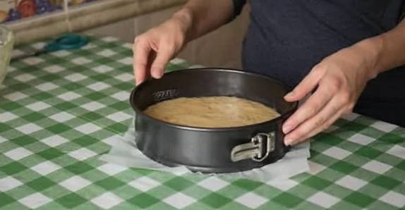 - We verspreiden de helft van het deeg in een voorgeoliede uitneembare vorm.