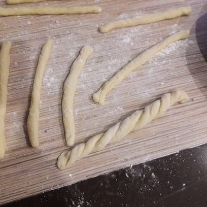 - Van het resterende derde deel van het deeg vormen we korte flagellen en weven ze samen in tweeën.