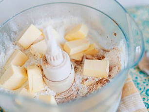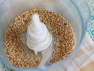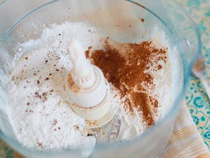 - Doe bloem en noten in de kom van de keukenmachine, voeg zout, suiker, kaneel en kruidnagel toe.