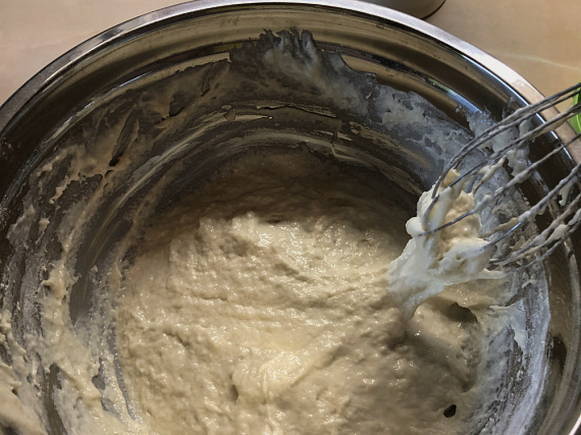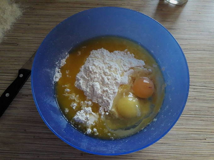 - We kloppen de eieren erdoor en voegen geleidelijk de bloem toe. Het deeg wordt iets dunner.