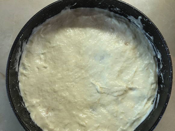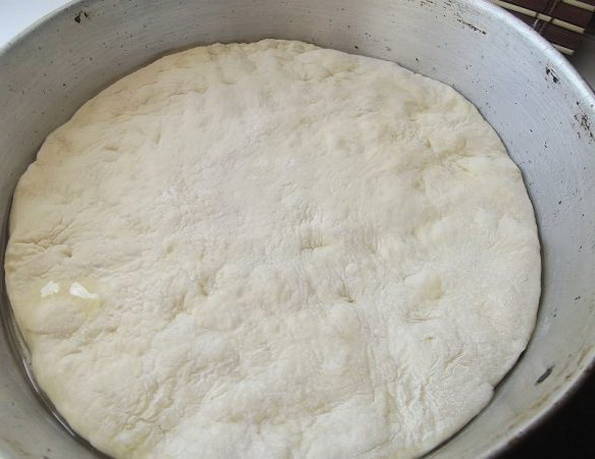 - Bestrooi het deeg met bloem, dek het af met huishoudfolie of een handdoek en leg het op een warme plaats gedurende 3 uur, kneed het ongeveer een keer per uur.