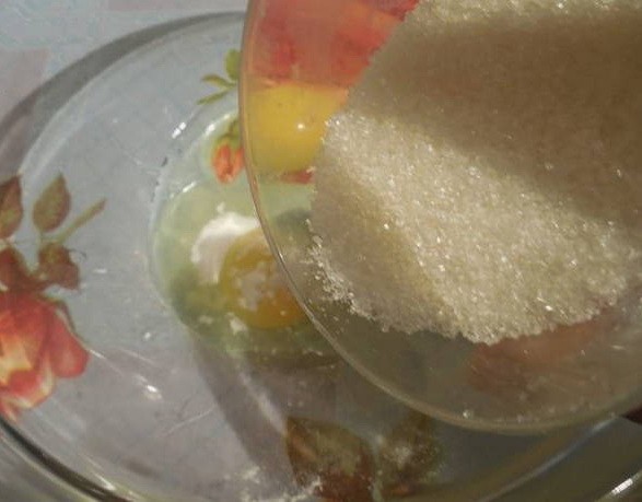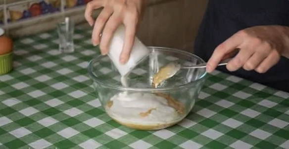 - Voeg suiker en kefir toe, terwijl je het mengsel roert.