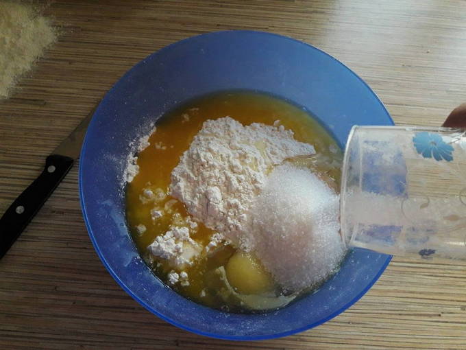 - Voeg zout, suiker, boter en eieren toe aan kefir. Goed mengen.