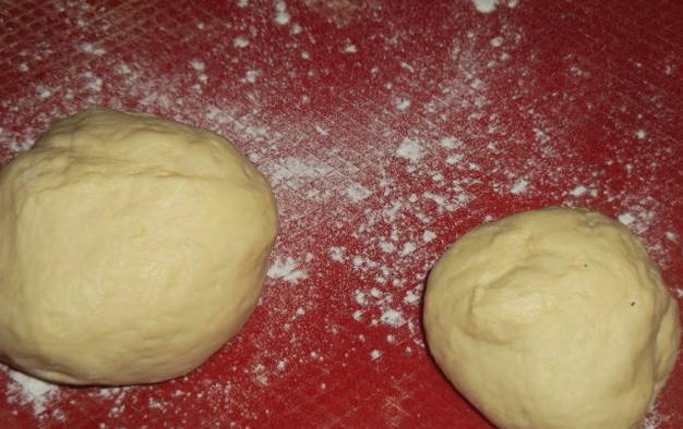 Voeg soda geblust met azijn toe aan het mengsel. Giet de bloem erbij en laat ongeveer een half glas achter. Kneed het deeg en verdeel het in twee delen, groter en kleiner.