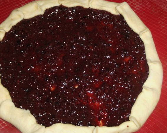 - Rol het grootste deel uit tot een cake. De dikte moet ongeveer 1 centimeter zijn. We verspreiden het deeg op een bakplaat bekleed met perkament. Leg er warme jam op en buig de randen van het deeg om de zijkanten te vormen.