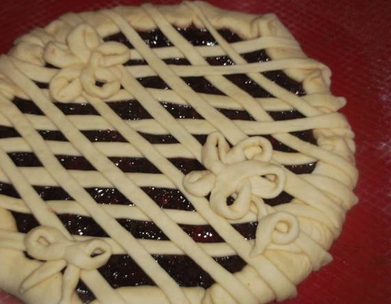 - Rol het overgebleven stuk deeg uit en snijd het in reepjes. We verspreiden de stroken over de vulling met een gaas, je kunt decoratieve elementen toevoegen.