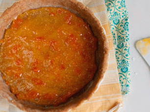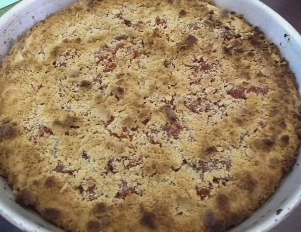 Doe de jam op het deeg, wrijf het gekoelde deeg op een grove rasp over de jam. We bakken de taart een half uur in een op 200 graden voorverwarmde oven. Geniet van je thee!