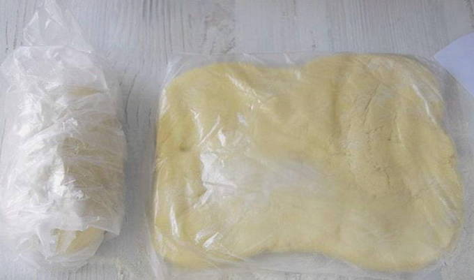 - We leggen het afgescheiden deel ongeveer een half uur in de vriezer. We wikkelen ook het resterende deeg in folie en leggen het 10 minuten in de koelkast.