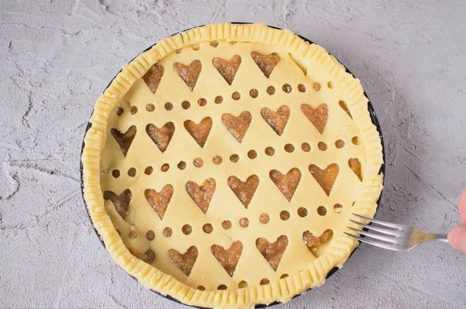 - Bedek de vulling met de tweede laag deeg, snijd de randen in vorm. We maken een rand van het resterende deeg en drukken ze met een vork.