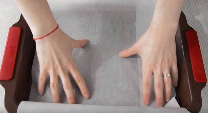 Rol de rest van het deeg uit onder een ovenschaal. We bekleden de bodem van de vorm met perkament en verspreiden het deeg erop.