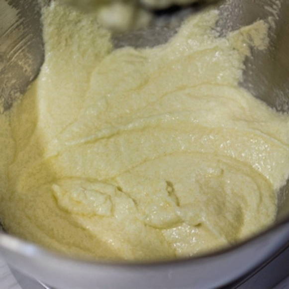 Meng boter met suiker en vanille, roer tot een gladde massa. Giet de eieren erin, meng.