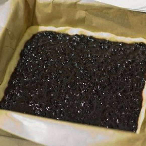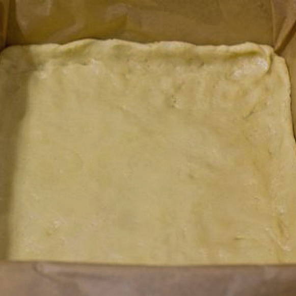 - We verspreiden de helft van het deeg in een voorgeoliede uitneembare vorm.