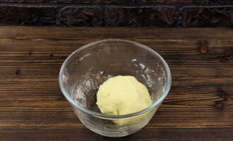 Bloem zeven met bakpoeder. We sturen het droge mengsel naar de totale massa. Kneed de producten tot een gladde, homogene klont.