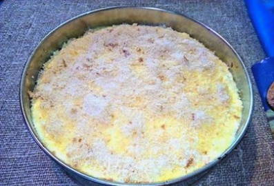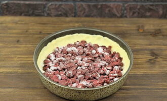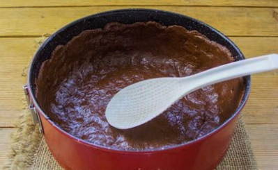- Doe het resulterende deeg in een ovenschaal. We drukken het stevig tegen de bodem en muren. We bakken 10 minuten op 160 graden.