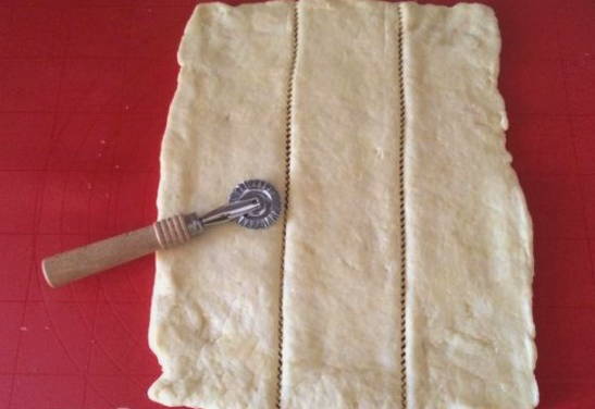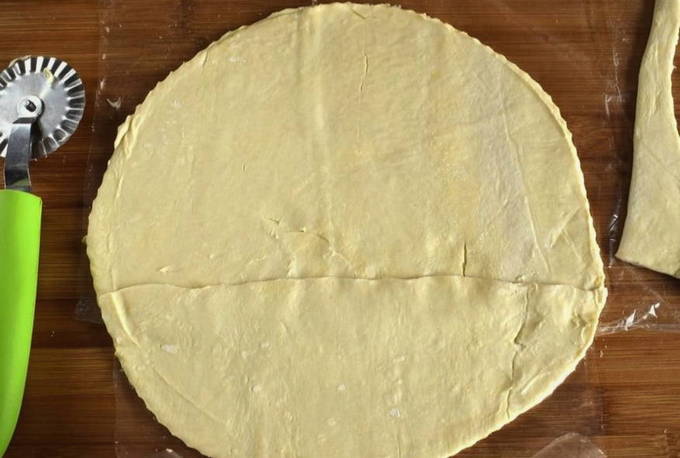 - Verdeel het bladerdeeg in twee delen. We rollen er een uit voor de basis van de cake. De andere laten we voor decoratie.