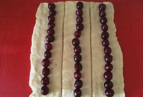 - Leg elk van de reepjes gewassen ontpitte kersen neer.