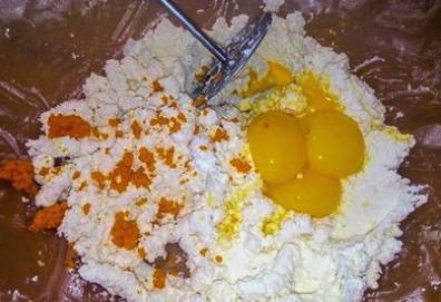 - Kook griesmeel in melk. Daarna mengen we de pap met kwark, rasp, suiker en drie kippeneieren. Kneed de massa tot een gladde massa.