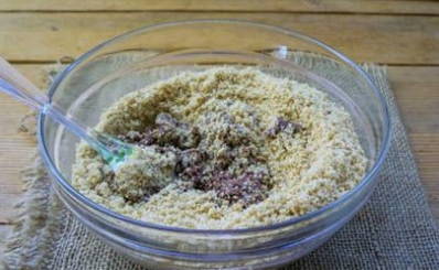Om de kruimels te bereiden, roer de bloem, boter en poedersuiker.