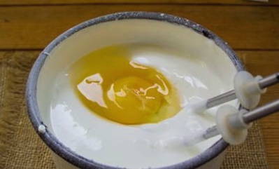 - Bereid op dit moment zure room voor. Combineer de resterende zure room met suiker en eieren. Klop de massa grondig tot luchtig.