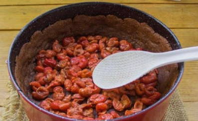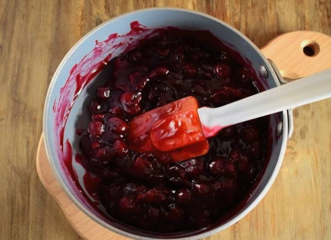 - Giet de kersenmassa in een pan. Breng de inhoud aan de kook en kook 1-2 minuten tot het ingedikt is.
